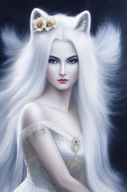 Full length oil painting of gorgeous woman as a translucent arctic fox spirit| detailed face| wearing white dress| straight white hair| mythical| elegant| hyperrealism| highly detailed| intricate detailed| volumetric lighting| Ukiyo-E| by Anne Stokes and Noriyoshi Ohrai |