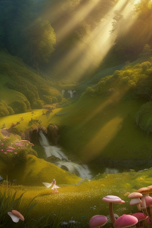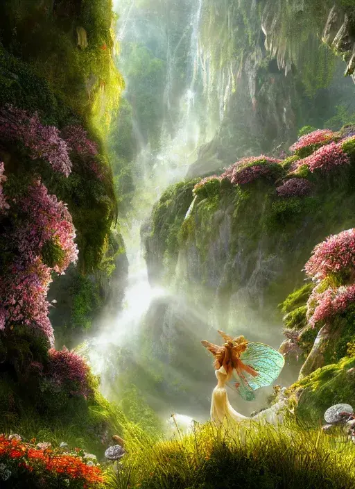 An elegant winged fairy in the lord of the rings scenery landscape, looking out at a vast lush valley flowers and homes made of mushrooms, stream,sunrise, god's rays highly detailed, vivid color, cinematic lighting, perfect composition, 8 k, gustave dore, derek zabrocki, greg rutkowski, belsinski, octane render. |