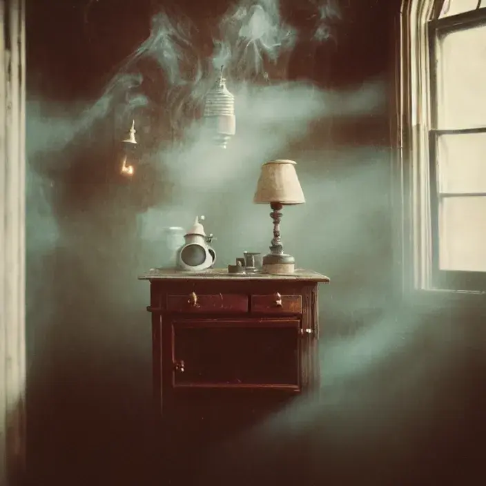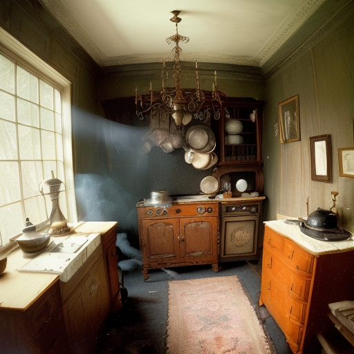 kodak portra 4 0 0, wetplate, fisheye, award - winning portrait by britt marling, 1 8 8 0 s kitchen, ghost, picture frames, shining lamps, dust, smoke, 1 8 8 0 s furniture, wallpaper, carpet, books, muted colours, wood, fog, plants, flowers Seed: 2821464957 |