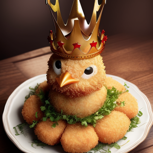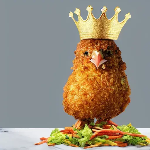 standing breaded chicken with a crown of a king in top of it, hyper realistic, 4k Seed: 696140872 |
