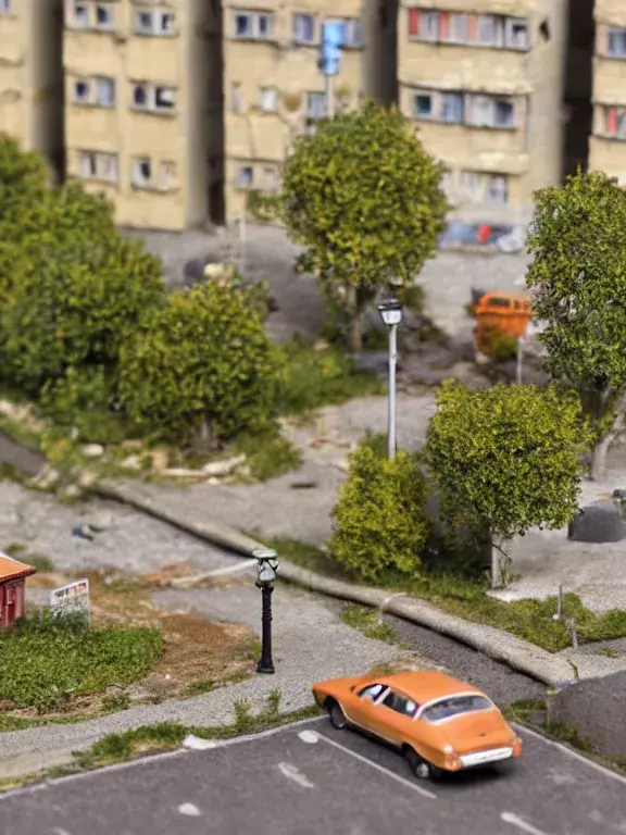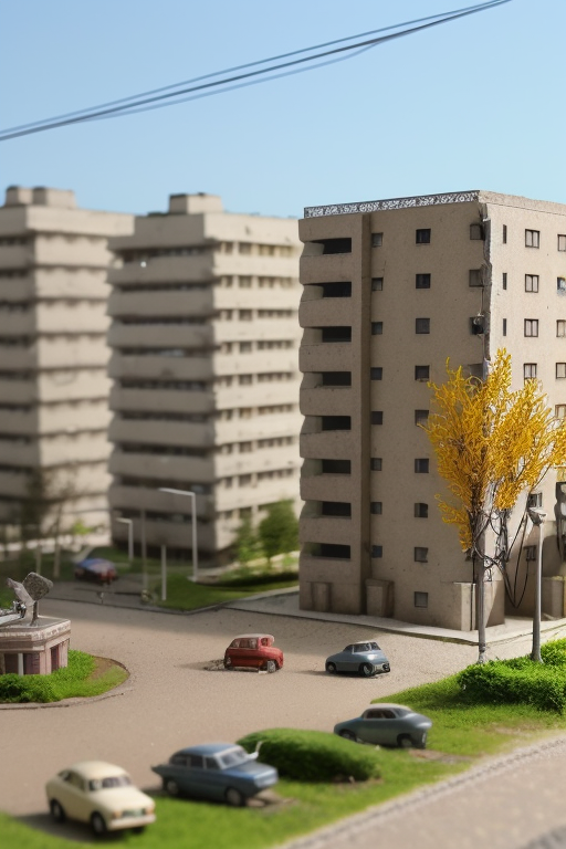 detailed miniature diorama a soviet residential building, brutalism architecture, car parking nearby, elderly man passing by, sunny day, warm and joyful atmosphere, summer, streetlamps, several birches nearby Seed: 1955553677 |