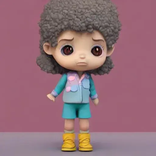Cute sad girl toy, curly hair, standing character, soft smooth lighting, soft pastel colors, skottie young, 3d blender render, polycount, modular constructivism, physically based rendering, square image |