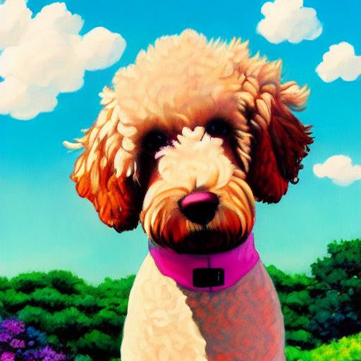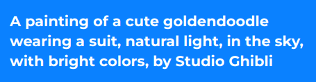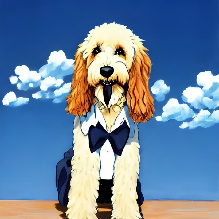 A painting of a cute goldendoodle in the sky, wearing a suit, natural light, with bright colors, by Studio Ghibli 프롬프트에서 "in the sky"를 앞쪽으로 옮겼더니 훨씬 나아졌음을 알 수 있다. |