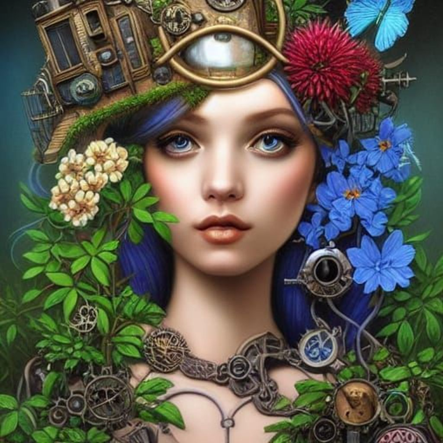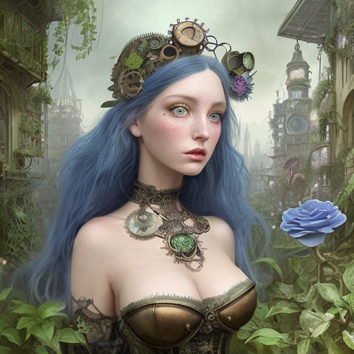 very detailed female, steampunk city taken over by plants in the background, d & d, fantasy, with blue flowers, beautiful face, hyperrealism delicate detailed complex, sophisticated, vibrant colors, volumetric lighting, pop surrealism art by Mark Ryden and Anna Dittmann |