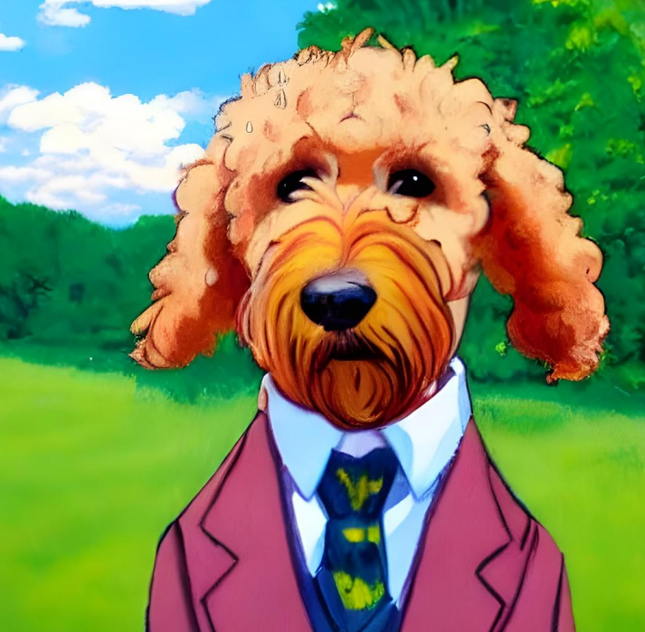 A painting of a cute goldendoodle wearing a suit, natural light, in the sky, with bright colors, by Studio Ghibli 양복을 입은 금색 푸들이 지브리 스타일로 잘 표현되었다. 그런데, "in the sky"가 잘 나타나지 안았다. 하지만, 프롬프트에 들어간 단어의 순서만 약간 바꿔주어도 해결될 수 있다. 먼저 나오는 단어를 더 중요하게 취급하기 때문이다. |
