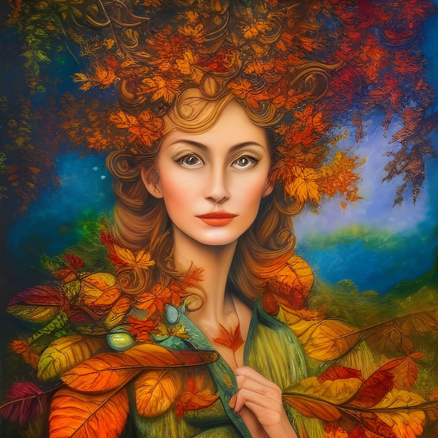 an oil painting of the autumnal equinox,a woman surrounded by autumn leaves, an airbrush painting by Josephine Wall, deviantart, psychedelic art, airbrush art, detailed painting, pre-raphaelite, 3d render, rococo art |