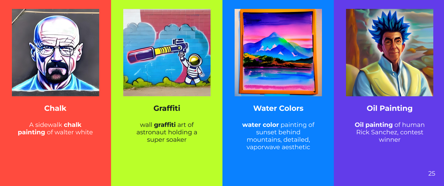 이 이외에도 Highly detailed(매우 세밀한), Studio Lighting(스튜디오 조명), Professional(전문가), Trending on artstation(아트스테이션의 최신 경향), Unreal engine(언리얼 엔진), Vivid Color(선명한 강렬한 색), Bocke(보케)을 넣어주면 보다 감각적이며, 좀더 전문적인 느낌의 사진이 만들어지는 경향이 있다. 이외에도 High resolution scan이라는 수식어를 넣어주면 역사적인 (오래된) 사진의 느낌이 날 수 있다.
