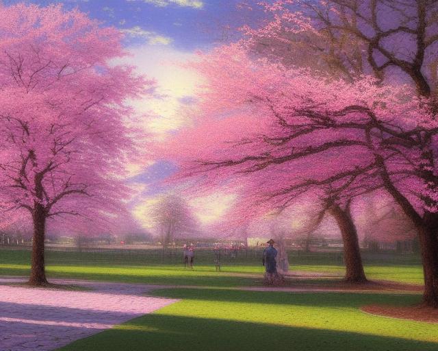 Easy Diffusion에서는 생성된 이미지위에 마우스를 올리면 나타나는 "Make similar image" 단추를 누르면 쉽게 생성할 수 있다. 왼쪽은 프롬프트 "cherry blossom in a empty park, by Thomas Kinkade"로 생성한 이미지중 하나이며, 오른쪽은 이 기능으로 만들어 본 비슷한 분위기의 그림이다.
