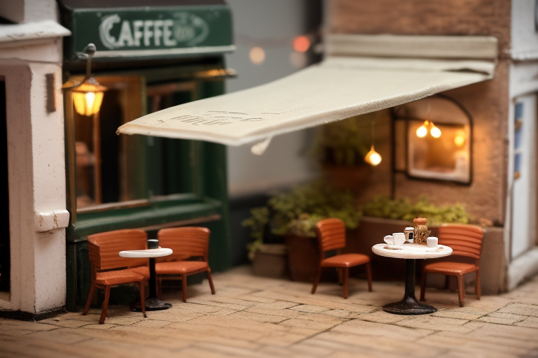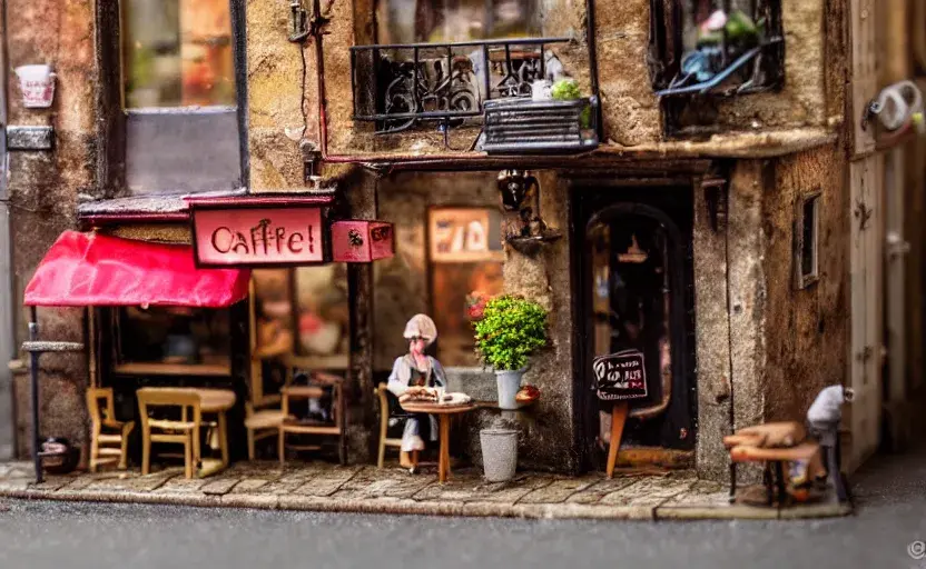 Miniature cafe diorama macro photography, cafe for mice, alleyway, ambient, atmospheric, british, bokeh,romantic |