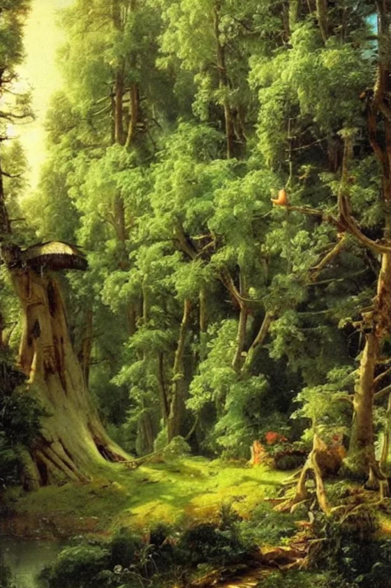 Oil painting of a fantasy treehouse by ivan shishkin and aivazovsky, highly detailed, masterpiece |