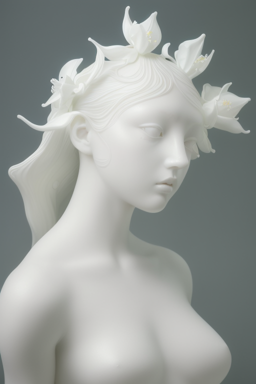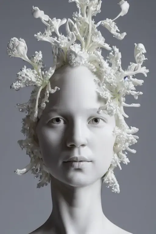 full head and shoulders, beautiful female porcelain sculpture by daniel arsham and james jean, smooth, all white features on a white background, delicate facial features, white eyes, white lashes, detailed tangled white lillies and lillie leaves on the head, volumetric lighting |