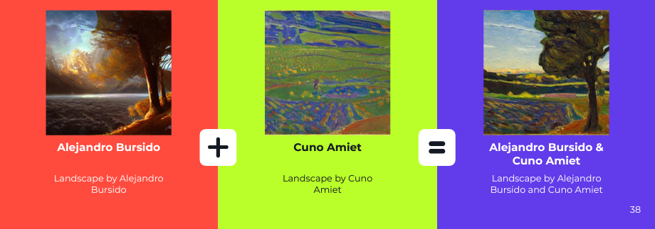 아래는 Stable Diffusion으로 만든 이미지와, 이 영상을 만들기 위해 사용한 프롬프트를 비교한 것이다. 왼쪽은 프롬프트북에 나온 작품, 가운데는 동일한 프롬프트로 직접 생성한 이미지이다.