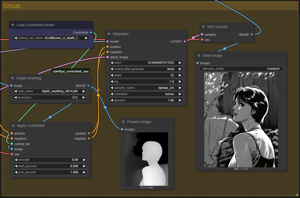 이 워크플로 후반부는 Depth ControlNet을 사용하여 이미지 아웃라인을 추출한 후, 샘플링을 통해 이미지를 생성하는 부분입니다.