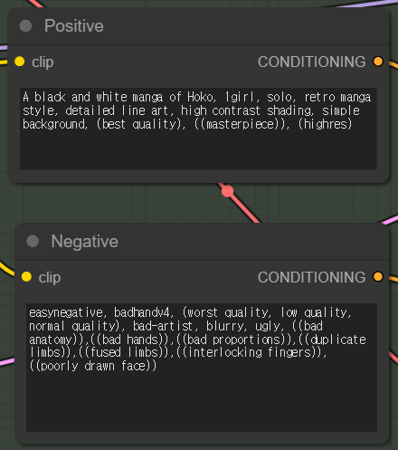 이 워크플로에서는 이미지 생성에 필요한 프롬프트입니다. "A black and white manga of Hoko, 1girl, solo, retro manga style, detailed line art, high contrast shading, simple background" 까지는 모두 LoRA 에서 추천하는 프롬프트입니다.