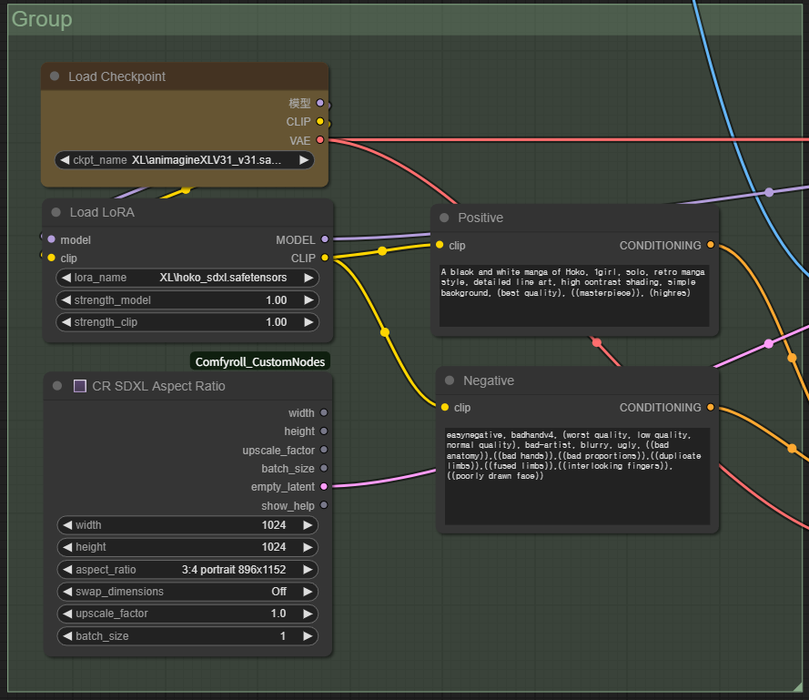 이 워크플로에서는 SDXL Hoko Manga Style LoRA 모델을 사용합니다. 다운로드 받아 ComfyUI\models\loras 폴더에 넣어주시면 됩니다.