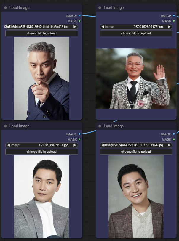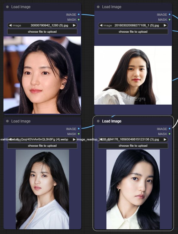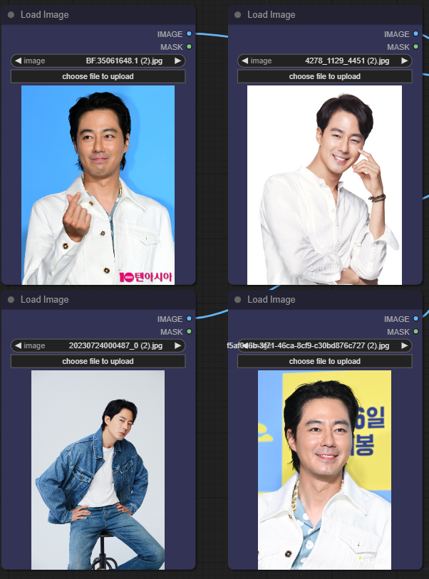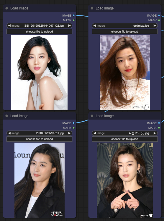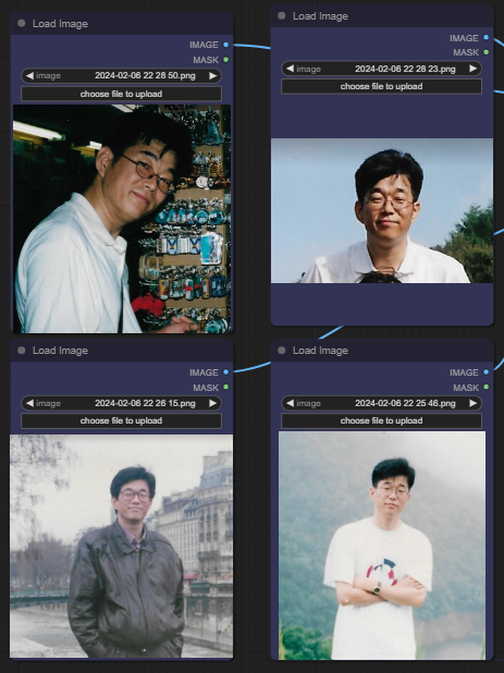 4개의 [Load Image] 노드에 적당한 이미지를 올려줍니다. 자신의 사진도 좋고, 인터넷에서 찾은 유명인 사진도 좋습니다. 아래는 제 사진중에서 오래된 사진을 몇장 사용했습니다. 그다지 해상도가 높지 않아도 특징만 살아있으면 괜찮은 듯 합니다.