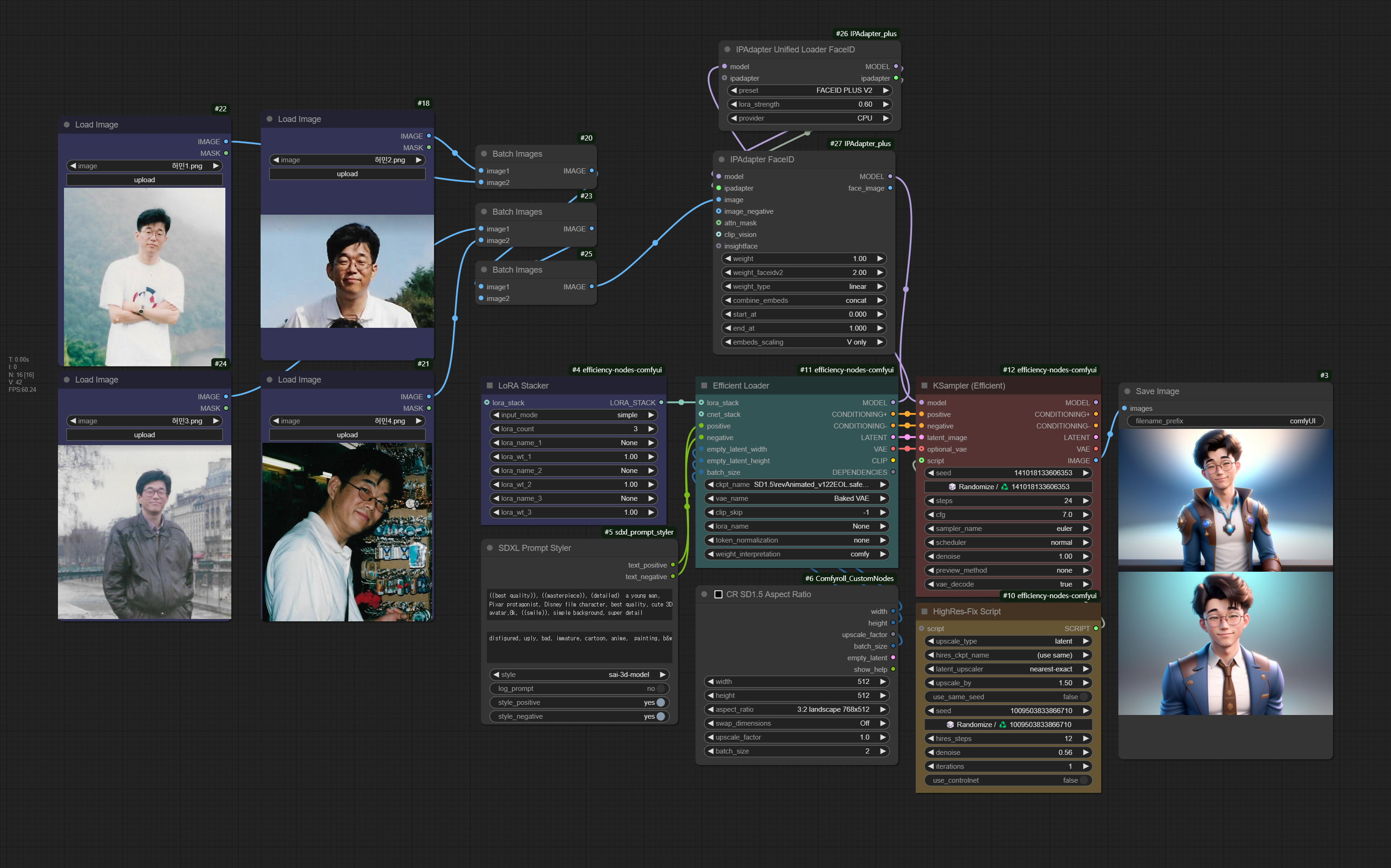 이제 메뉴에서 [Queue Prompt]를 누르면 이미지가 생성됩니다. 제 원판보다 너무 잘 나왔습니다만, 그래도 제 얼굴의 특징이 살아 있으면서도 3D 캐릭터의 특성이 잘 살아있어 너무 기분이 좋네요.