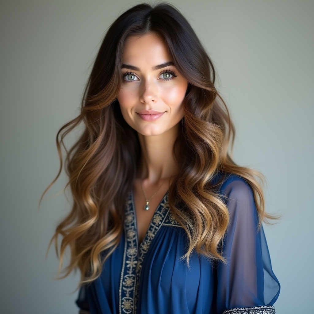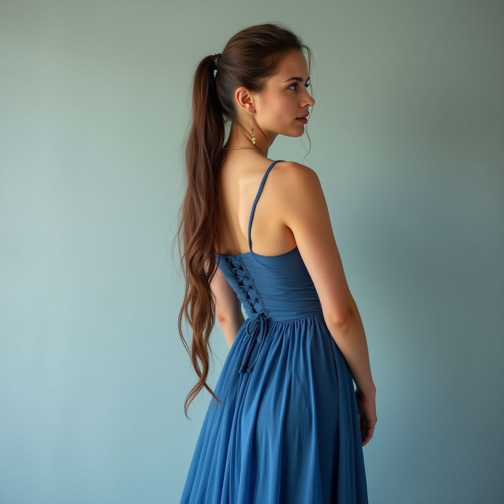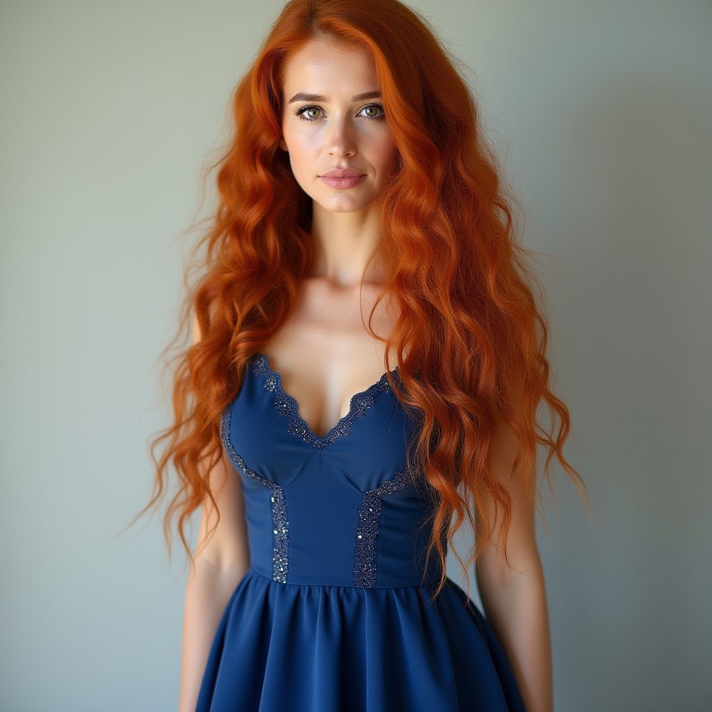 프롬프트: 30 years old woman, long wavy {color} hair, elegant vintage blue dress, photo studio, light background