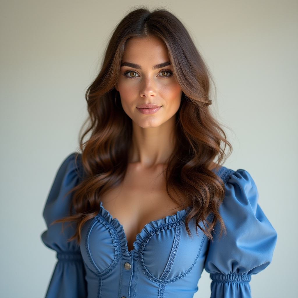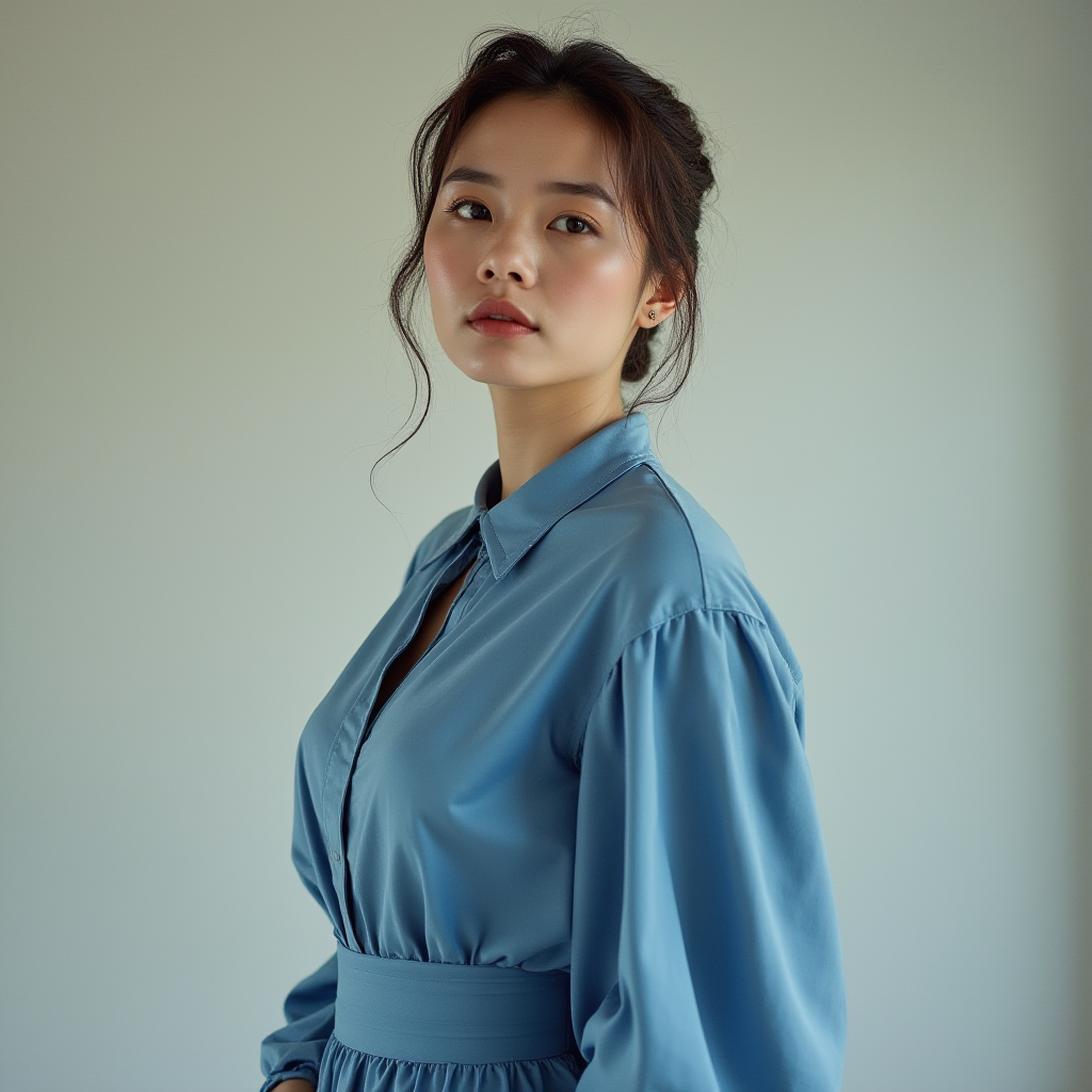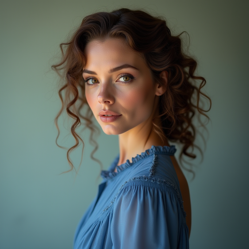 30 years old woman, {hairstyle}, elegant vintage blue dress, photo studio, light background