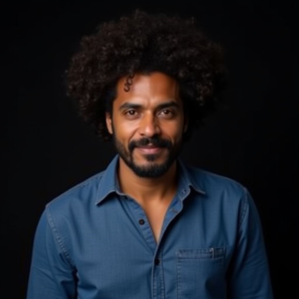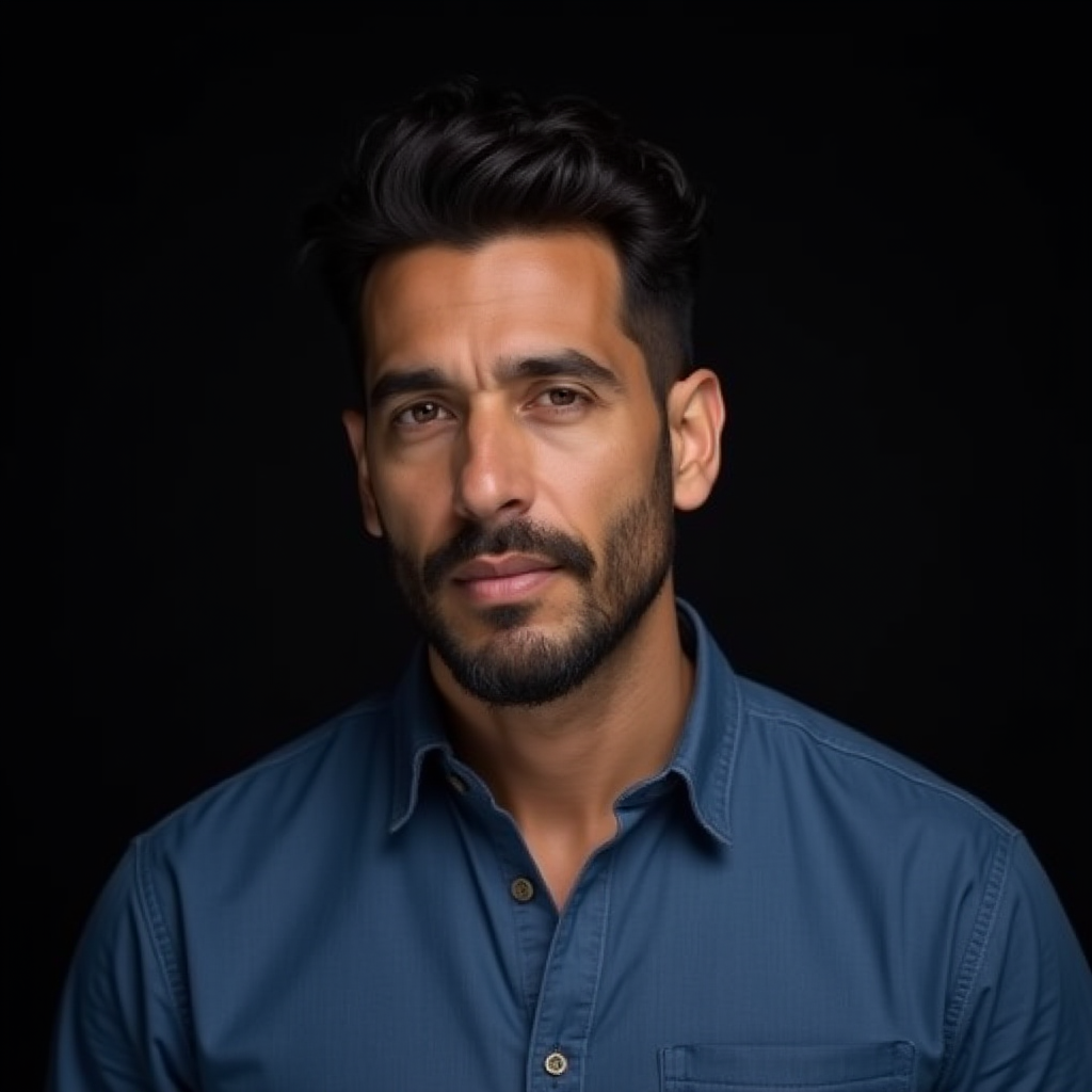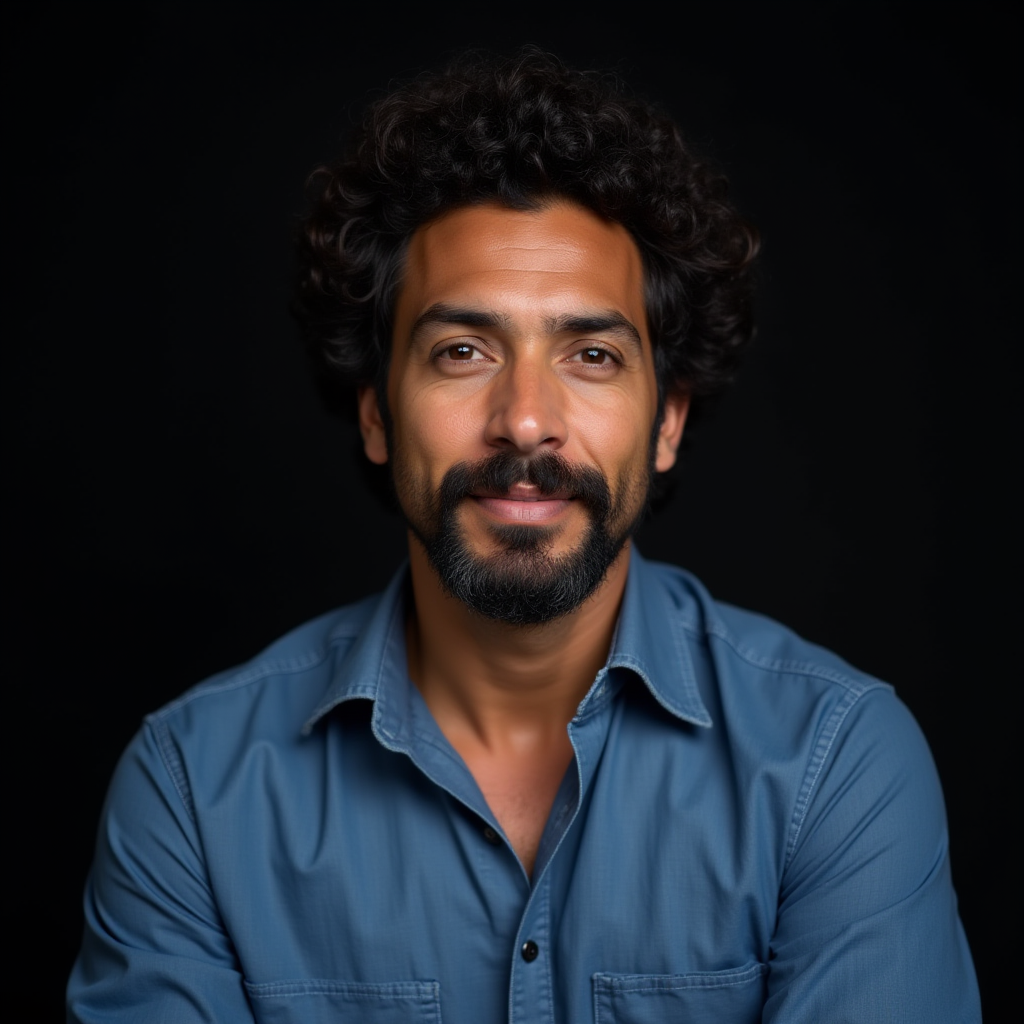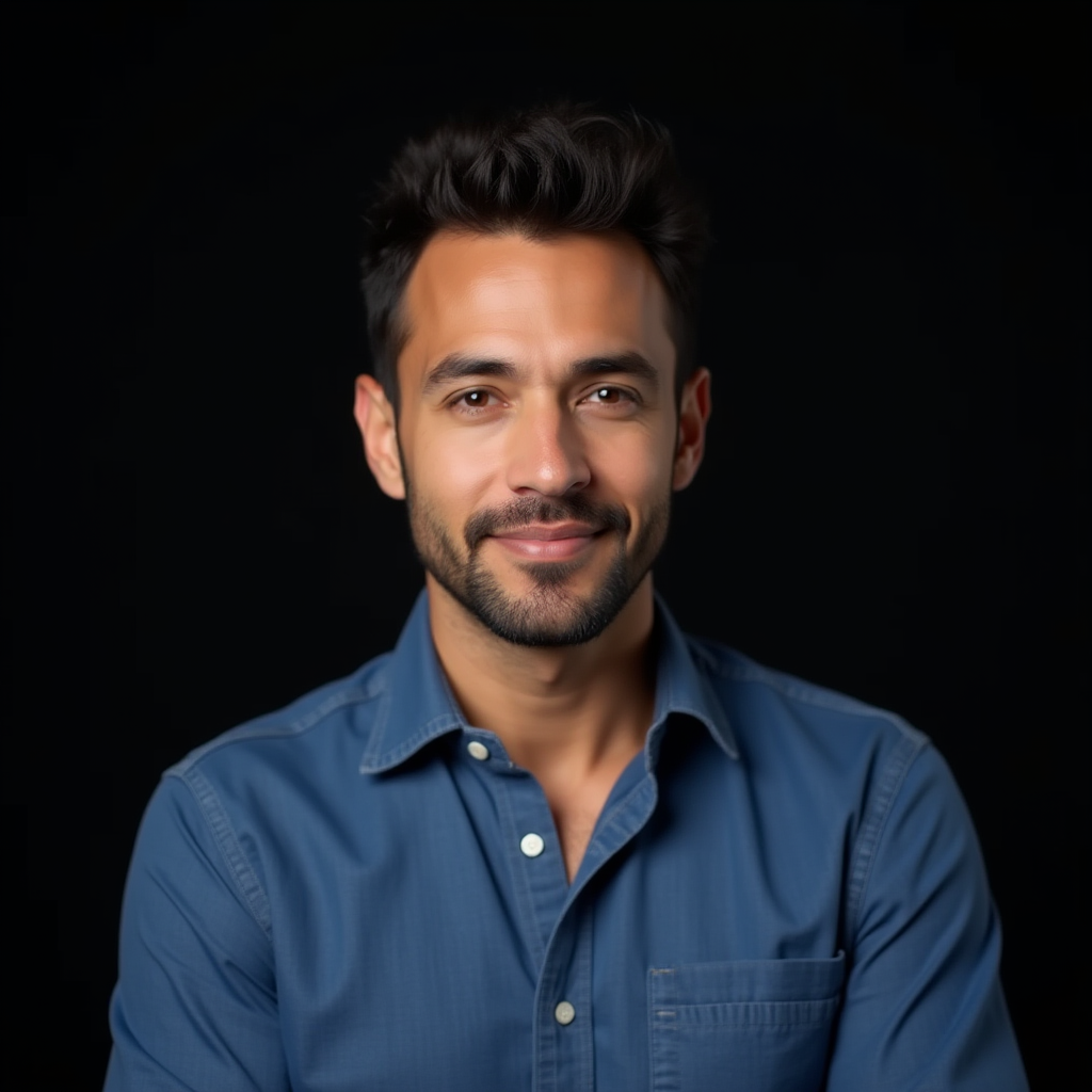40 years old latino man, {hairstyle}, blue linen shirt, photo studio, dark background