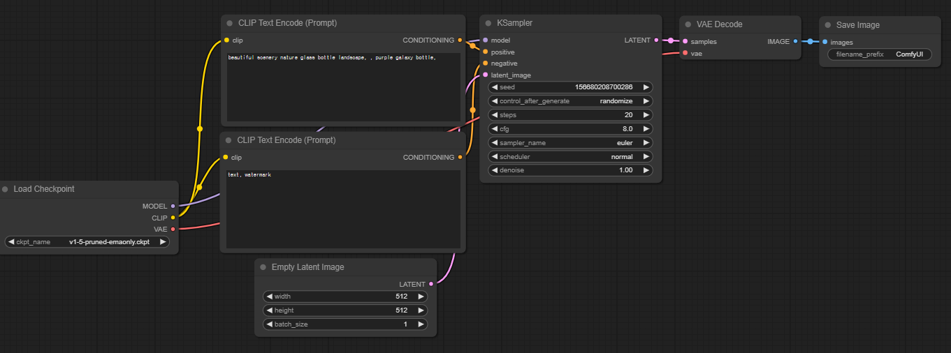 제일 간단한 워크플로를 생성해 보겠습니다. 먼저 [Queue Prompt] 명령창에서 [Load Default]를 클릭합니다. 그러면 아래와 같이 가장 기본적인 SD1.5용 워크플로가 나타납니다.