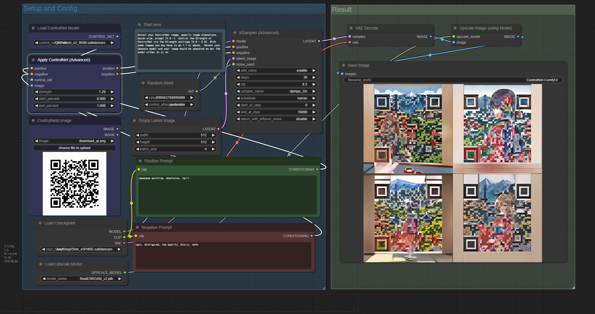 이제 [Queue Prompt] 버튼을 눌러주면 이미지가 생성됩니다. 생성된 이미지에 QR 코드가 너무 강할 경우, [Apply ControlNet] 노드의 stength를 낮추고, 너무 약하면 strength를 높여주면서 여러번 출력하여 마음에 드는 이미지를 선택하면 됩니다. 아래는 이제까지 만들어온 워크플로입니다.