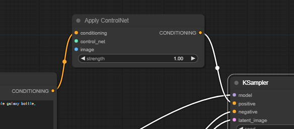여기에서 [Apply ControlNet] 노드를 추가하고, 아래와 같이 [CLIP Text Encode(Prompt)] 노드와 [KSampler]노드 사이에 끼워넣고 CONDITIONING과 conditioning을 연결해줍니다.