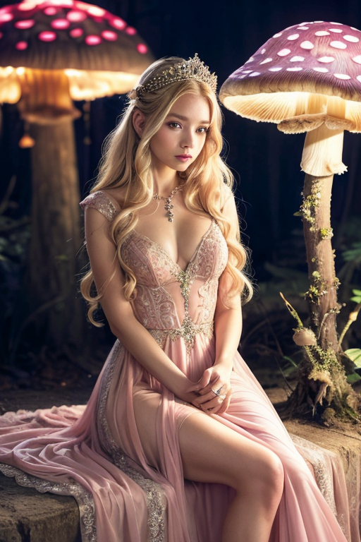 프롬프트: sit on floor, realistic beautiful princess in mushroom land, blonde, highlight hair, intricate, slim body, (pink princess gown:1.2), growing mushrooms, dim light, fantasy, bokeh, perfect face, looking intently at you