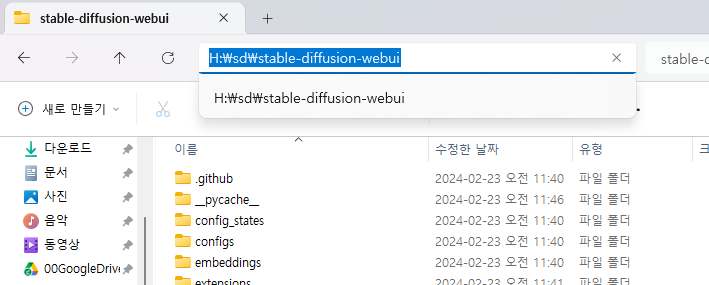 여기에서 " C:\path_to\stable-diffusion-webui"는 자신의 환경에 맞게 편집해 주시면 됩니다. 경로를 복사할 때에는 파일 탐색기로 stable-diffusion-webui 폴더로 들어간 후, 아래와 같이 주소 줄을 클릭하고 복사하시면 됩니다.