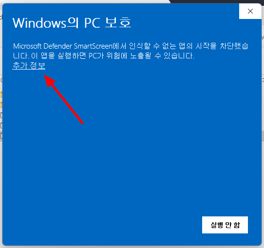 아래와 같이 "Windows의 PC 보호 화면"이 나타날 수 있는데, 추가 정보를 누르고 실행을 눌러주면 됩니다.