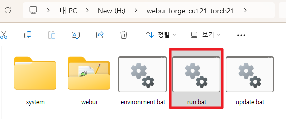 run.bat를 누르면 SD Forge가 실행됩니다. "Windows의 PC 보호 화면"이 나타나면 동일하게 처리하세요.
