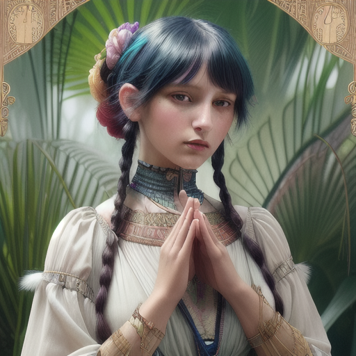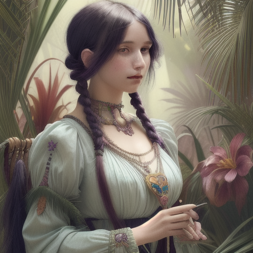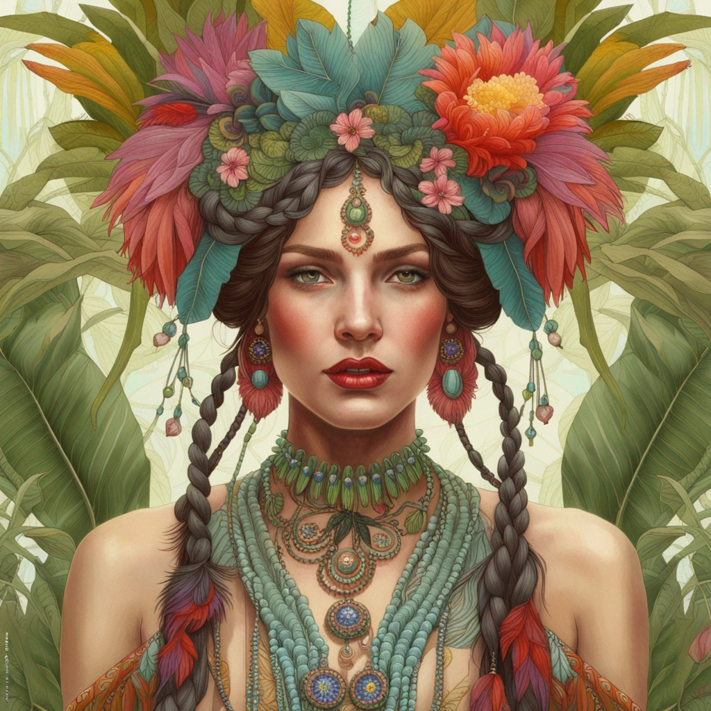프롬프트 : beautiful woman wearing fantastic hand-dyed cotton clothes, embellished beaded feather decorative fringe knots, colorful pigtail , subtropical flowers and plants, symmetrical face, intricate, elegant, highly detailed, 8k, digital painting,trending on pinterest, harper’s bazaar, concept, art, sharp focus, illustration, Tom Bagshaw, Lawrence Alma-Tadema, Alphonse Mucha