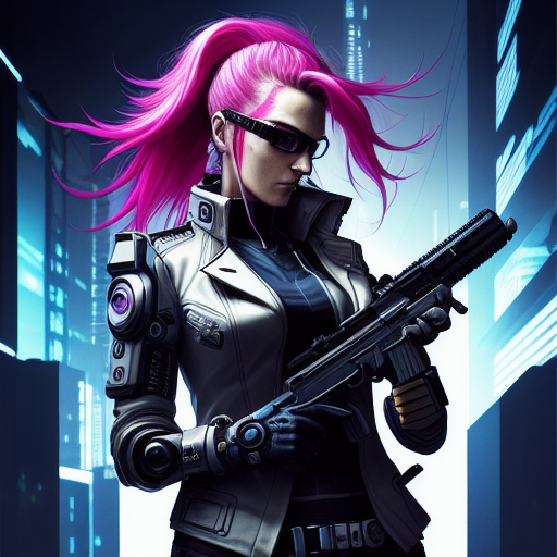 프롬프트 : a woman in a futuristic suit holding a gun in her hand, looking at the camera, cyberpunk art, neo-figurative, anime