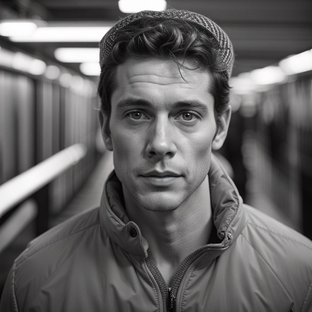 프롬프트: b&w photography, model shot, man in subway station, beautiful detailed eyes, professional award winning portrait photography, Zeiss 150mm f/2.8, highly detailed glossy eyes, high detailed skin, skin pores