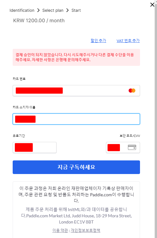 Start Pro를 누르면 아래와 같은 화면이 나옵니다. 적절하게 카드 정보를 입력하면 가입이 완료되었다는 화면이 나옵니다.