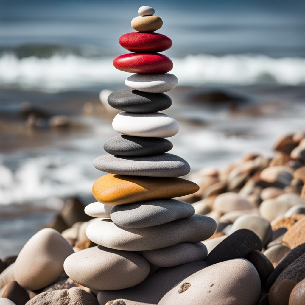 프롬프트 : a beautiful stack of rocks sitting on top of a beach, a picture, red black white golden colors, chakras, packshot, stock photo
