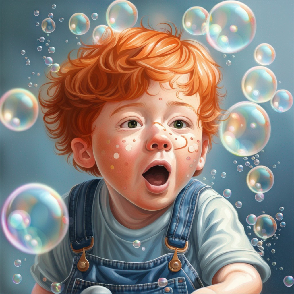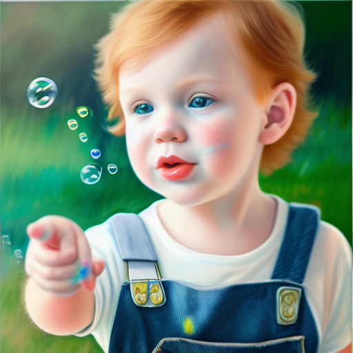 프롬프트: a little boy with ginger hair wearing denim overalls chasing bubbles. clean pastel painting, beautiful detailed face, lots of bubbles, photorealistic