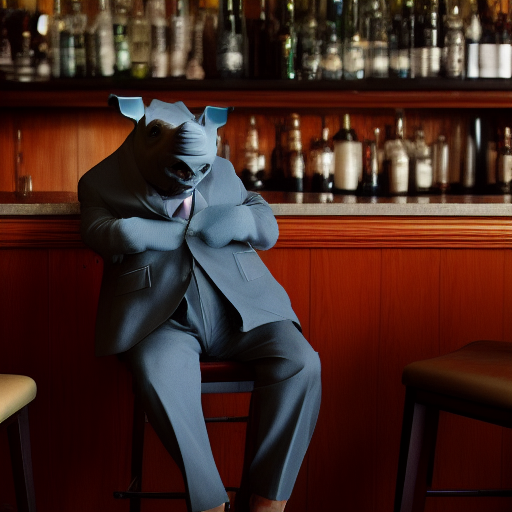 프롬프트: photo of a rhino dressed suit and tie sitting at a table in a bar with a bar stools, award winning photography, Elke vogelsang