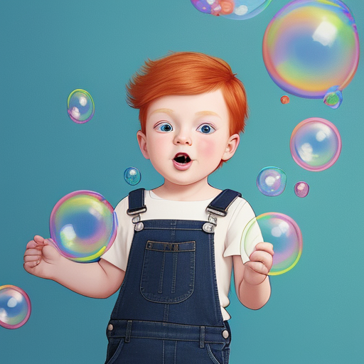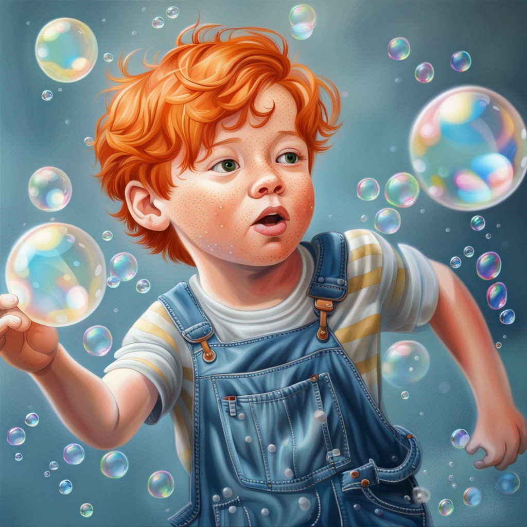 프롬프트: a little boy with ginger hair wearing denim overalls chasing bubbles. clean pastel painting, beautiful detailed face, lots of bubbles, photorealistic