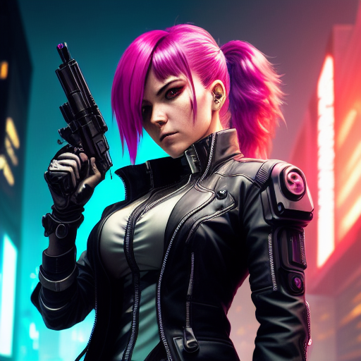 프롬프트 : a woman in a futuristic suit holding a gun in her hand, looking at the camera, cyberpunk art, neo-figurative, anime