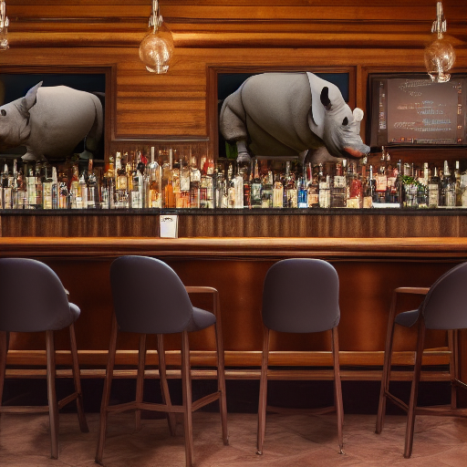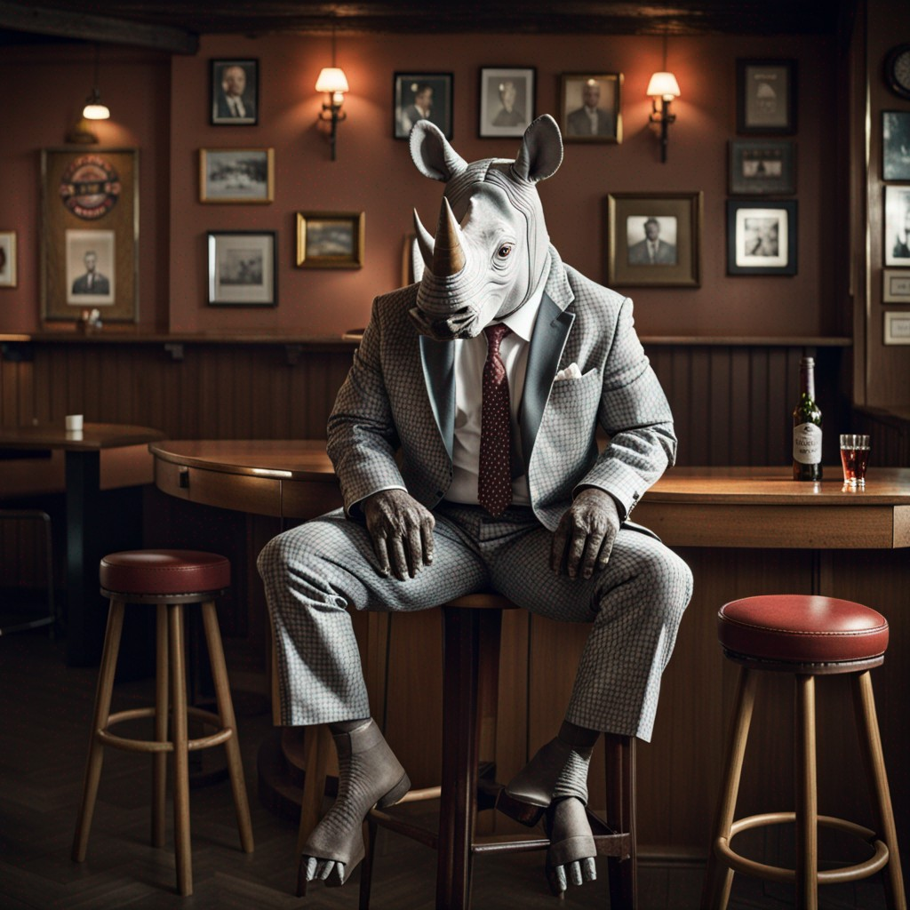 프롬프트: photo of a rhino dressed suit and tie sitting at a table in a bar with a bar stools, award winning photography, Elke vogelsang