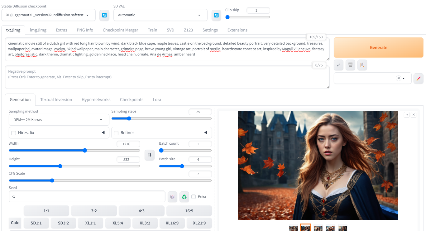 SVD로 비디오를 생성하기 위해서는 기본 이미지를 가져와야 합니다. 물론 자신의 사진이나 인터넷에서 가져와도 되는데, 저는 먼저 txt2img로 이미지를 생성하고, 이 이미지를 비디오로 만드는 방법을 사용하겠습니다.