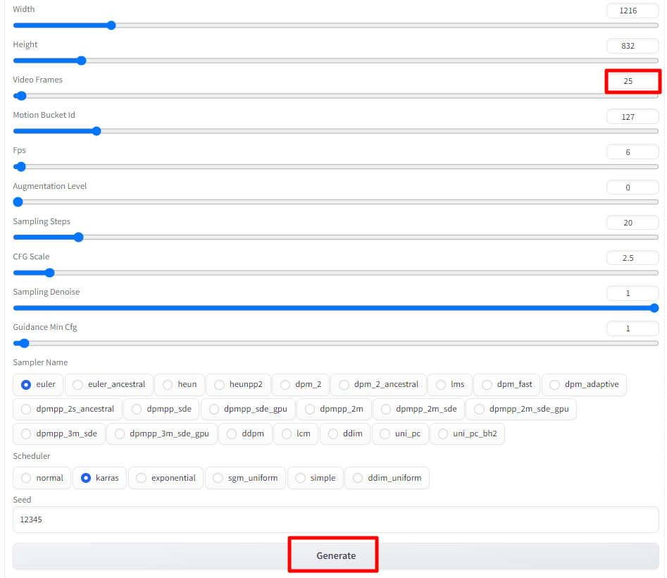 그 아래로 여러가지 매개변수를 설정할 수 있는데, 이미지 크기는 자동으로 설정된 것이고요, 저는 Video Frames만 25로 설정하고 [Generate] 버튼을 눌렀습니다.