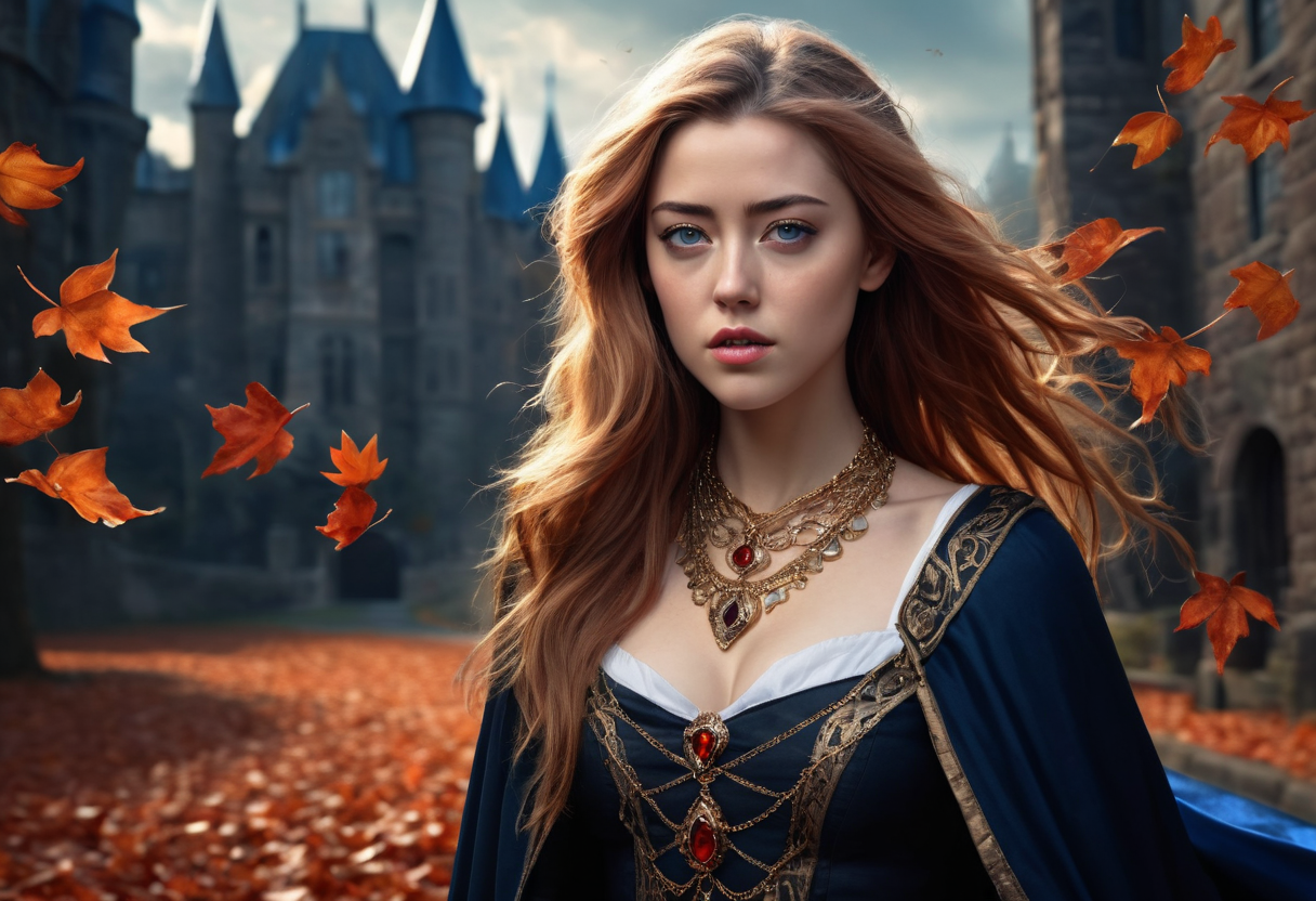 프롬프트: cinematic movie still of a dutch girl with red long hair blown by wind, dark black blue cape, maple leaves, castle on the background, detailed beauty portrait, very detailed background, treasures, wallpaper hd, avatar image, evelyn, 8k hd wallpaper, main character, grimoire page, brave young girl, vintage art, portrait of merlin, hearthstone concept art, inspired by Magali Villeneuve, fantasy art, photorealistic, dark theme, dramatic lighting, golden necklace, head chain, ornate, Ana de Armas, amber heard
