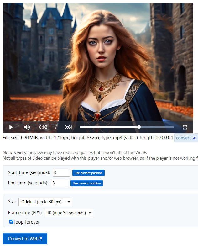 아쉽게도 움짤은 무조건 mp4로만 생성됩니다. 그래서 GIF나 webp 포맷을 사용하려면 따로 변환해야 합니다. 제가 많이 사용하는 ezgif.com 에서 변환하는 방법을 보여드리겠습니다. 저는 webp 포맷으로 변환하겠습니다.