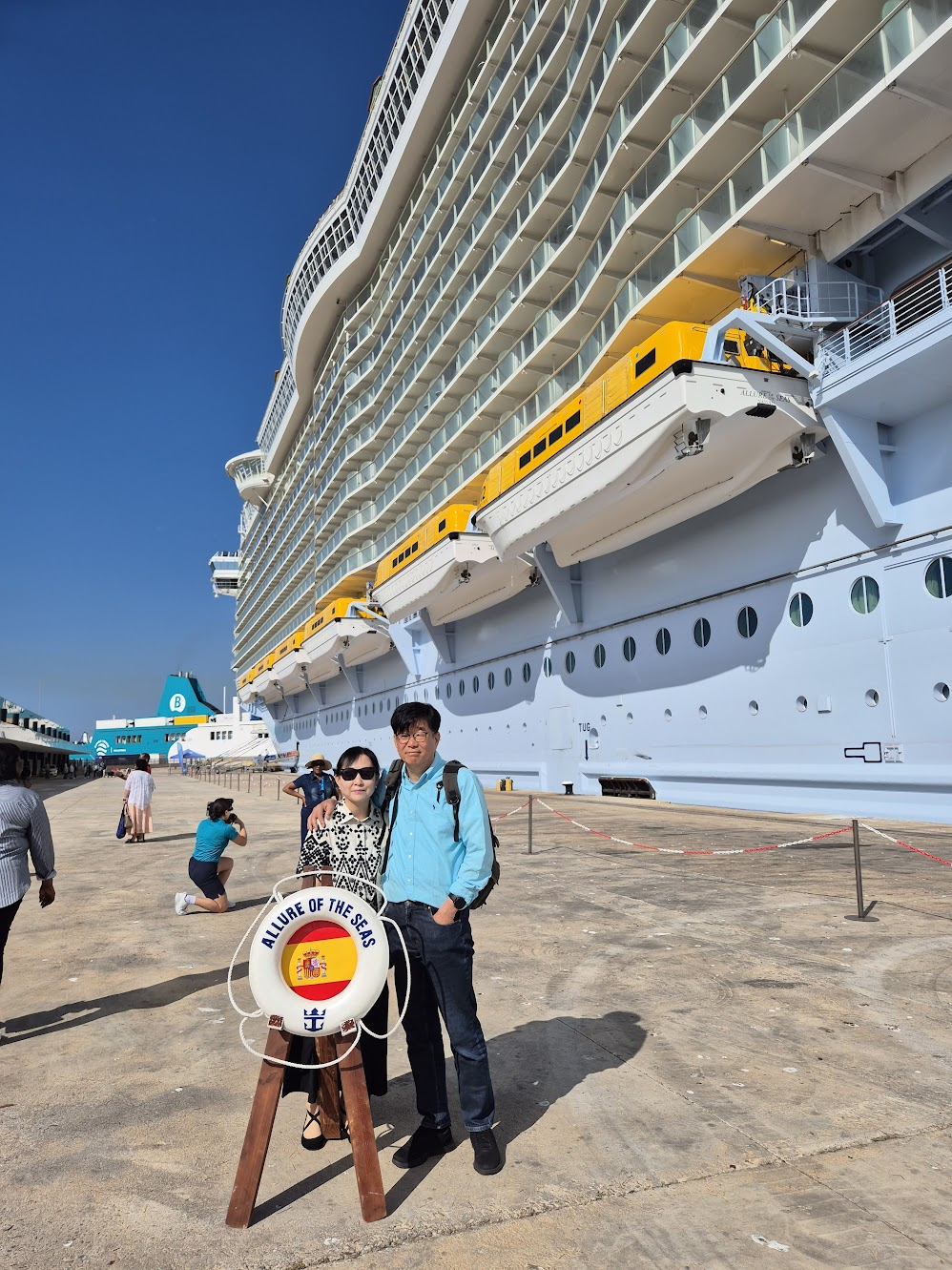 16층에 있는 부페 식당에서 식사를 하고 팔마항을 배경으로 사진 한장 촬영하고 준비해 하선했습니다. 하선하면 아래 우측처럼 소품을 세워두고 사진사들이 촬영을 하라고 권유하는데, 그냥 부담없이 촬영하면 됩니다. 구입 여부는 나중에 결정하면 되니까요. 그리고, 우리는 두 쌍이기 때문에 한 쌍이 사진 촬영할 때 그 옆에서 꼽사리로 끼어서 촬영했습니다. 사진을 구입하지 않다라도, 이렇게 전문 사진사들이 서있는 곳은 가장 좋은 위치니까요. ㅎ