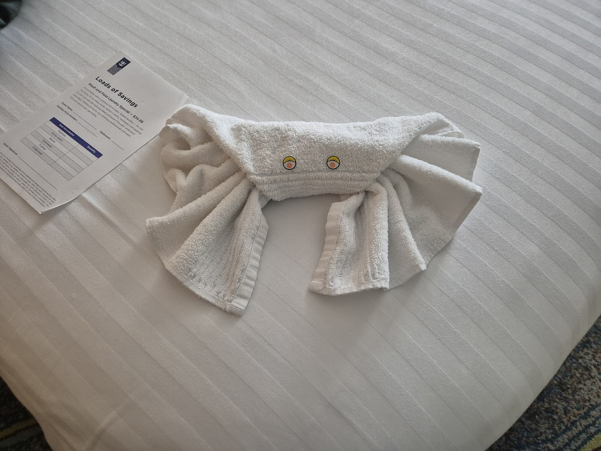 마요르카 관광을 마치고 돌아와보니, 수건을 게 모양으로 접어서 올려뒀더군요. 그런데... 이게 처음이자 마지막이었습니다. 예전 크루즈에서는 매일매일 모양이 다르게 수건을 접고, 심지어는 수건 접는 방법 (백조, 강아지) 을 시연해주는 프로그램도 있었는데 약간은 아쉬웠습니다. 물론 skateroom assistant만 힘들게 하는 아무 쓸데 없는 노력이죠. :)