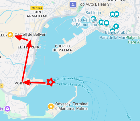 원래 이 날은 크루즈 선착장과 관광지 거리가 조금 애매해서 선택관광을 할까말까 고민했었습니다. 결국 화살표를 따라 벨베르 성까지 걸어가서 구경하고, 상황을 봐서 택시를 타거나 걷기로 계획했었죠. 그런데 선착장 위치가 더 아래쪽에 있는 위치로 바뀌면서 벨베르까지 걸어가기는 좀 부담이 되어 택시를 타고 가기로 했습니다.