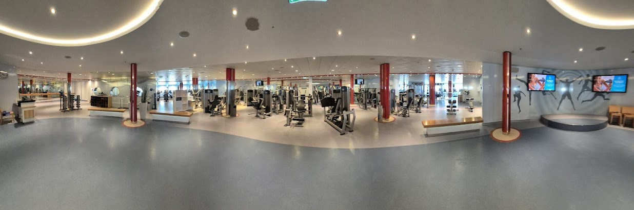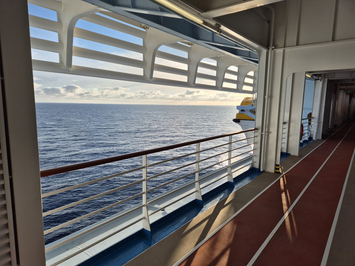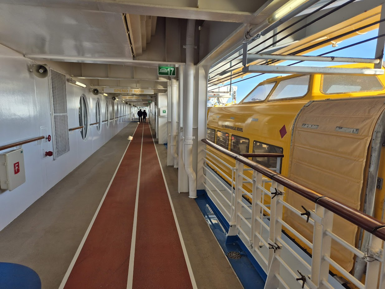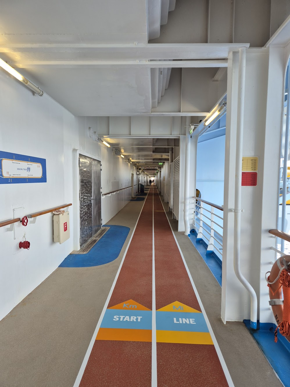 오호라... 그래서 일단 부딛쳐 보기로 했습니다. 5층 맨으로 가려니 중간에 아래처럼 조깅/워킹 트랙이 있습니다. 배 길이가 360미터이다보니 한 바퀴 돌면 거의 800미터 정도 되는 것 같았습니다. 오른쪽은 출발 지점입니다.