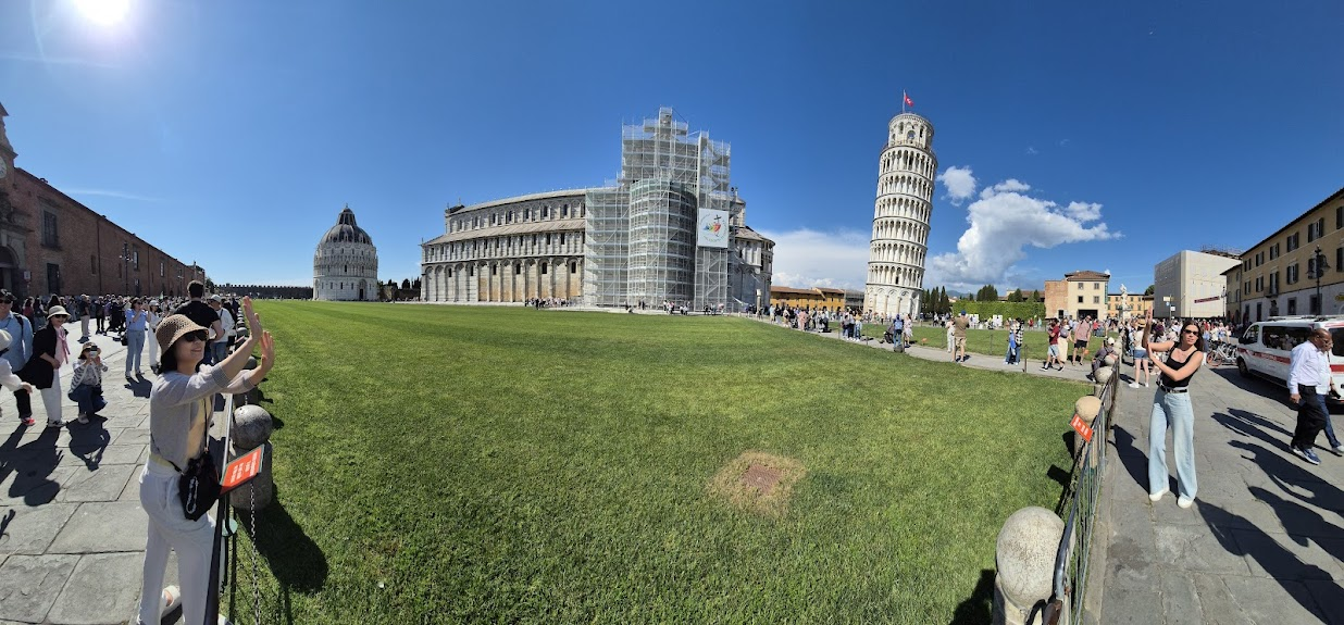 피사는 기본적으로 돌아다닐 곳이 많지 않습니다. 그냥 파노라마 한장에 모두 담깁니다. 좌우로 피사의 사탑을 밀고 있는 사람들이 보입니다. ㅎㅎ